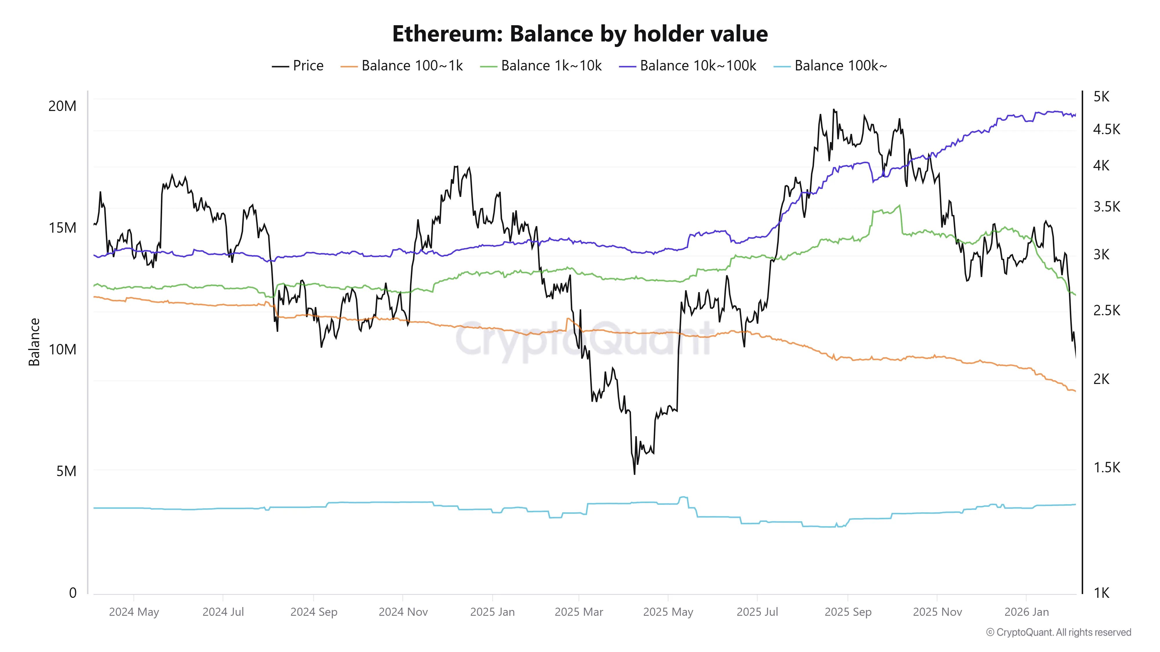 While the number of large-scale Ethereum holders has increased over the past five months, the prospects for a price recovery remain uncertain, according to an analysis by Cointelegraph. Addresses holding over 10,000 ETH have expanded their positions, with the number of wallets holding more than 100,000 ETH growing from 2.75 million to 3.68 million. In contrast, addresses holding between 100 and 1,000 ETH have decreased from 9.79 million to 8.32 million. The analysis notes that the current ETH price is below the average cost basis for most holders, placing the market in an overall state of loss. Cointelegraph concluded that negative on-chain indicators, including a surge in exchange inflows and the price trading below its realized price, suggest downward pressure is likely to persist for the time being.