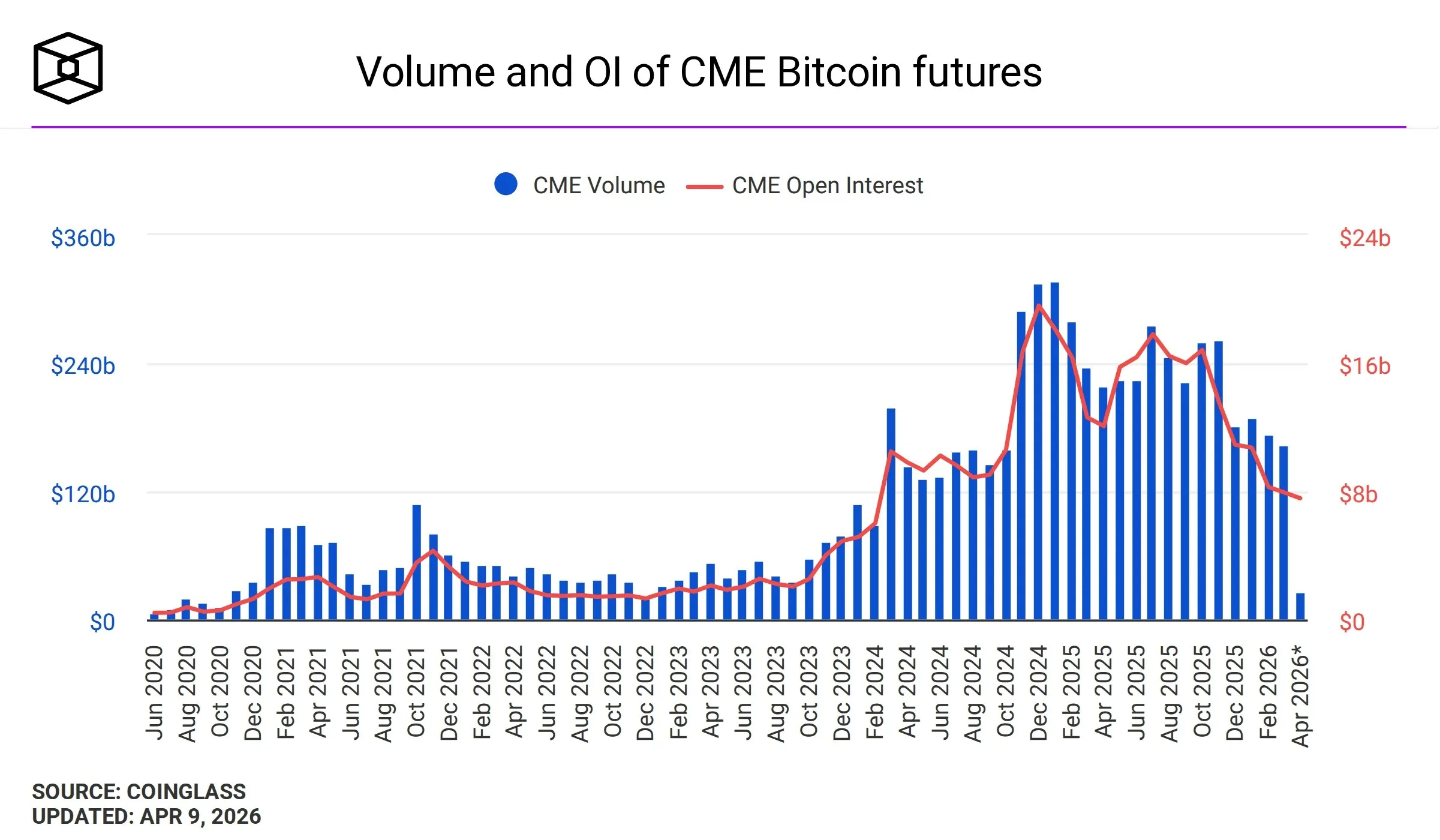 Monthly trading volume for Bitcoin futures on the U.S. Chicago Mercantile Exchange (CME) has fallen to its lowest level in 14 months, according to data from Unfolded. The analytics firm attributed the decline to weakened institutional demand resulting from the liquidation of basis trade positions.