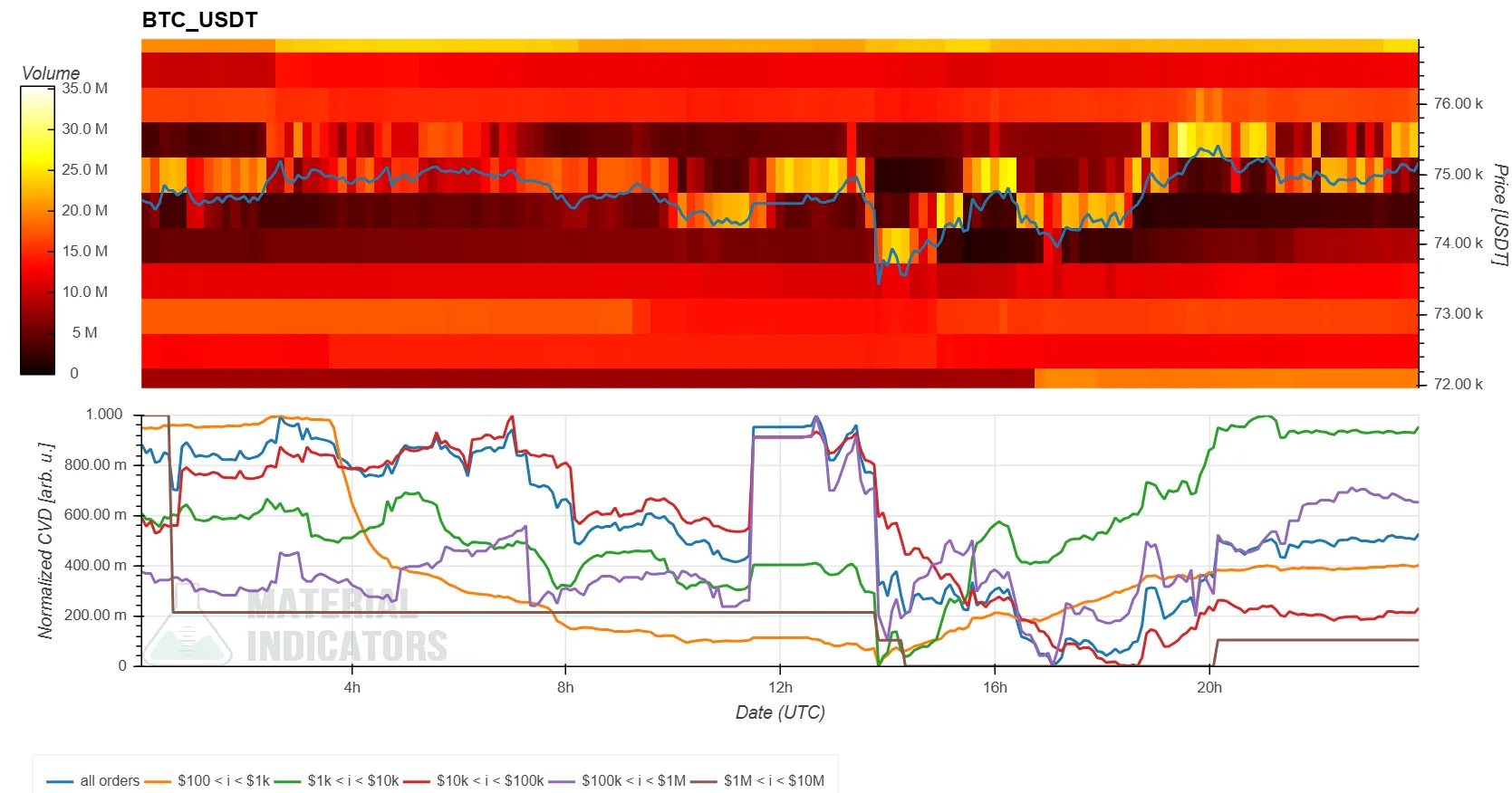 - The lower Cumulative Volume Delta (CVD) indicator represents buy and sell orders categorized by trade size. As buy orders increase, the corresponding colored line rises. The yellow line tracks orders between $100 and $1,000, while the brown line represents large orders ranging from $1 million to $10 million.