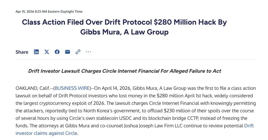 USDC issuer Circle (CRCL) is facing a class-action lawsuit for allegedly taking no action while the hacker behind the Drift (DRIFT) protocol swapped stolen funds, crypto lawyer Jacob Robinson reported on X. The plaintiffs allege that during the Drift hack on April 1, the attacker moved $230 million worth of USDC using Circle's own blockchain bridge, CCTP. They claim that Circle was aware of the situation but failed to freeze the assets, effectively permitting the transfer. Similar criticisms regarding Circle's inaction were raised within the crypto industry immediately following the hack.