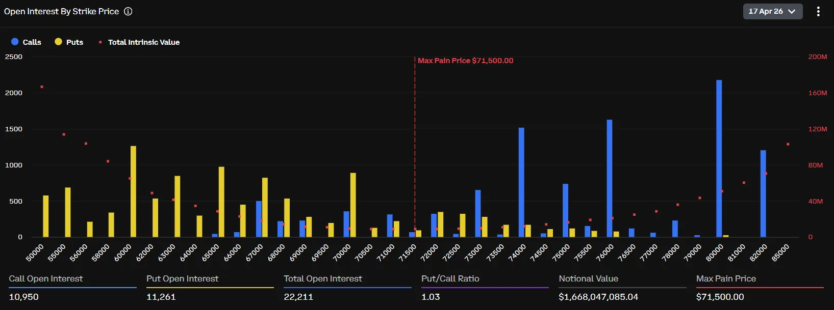 According to data from crypto options exchange Deribit, Bitcoin options valued at $1.67 billion are set to expire at 8:00 a.m. UTC today. The put/call ratio is 1.03, with a max pain price—the point at which the largest number of options would expire worthless—of $71,500. At the same time, $460 million in Ethereum options will also expire. These have a put/call ratio of 0.94 and a max pain price of $2,250.