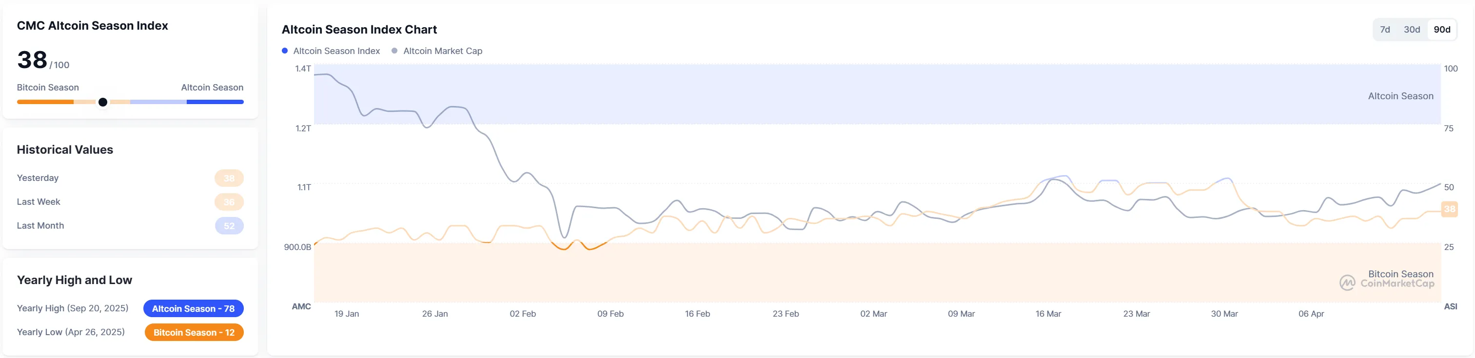 CoinMarketCap's Altcoin Season Index has climbed one point from the previous day to 38.