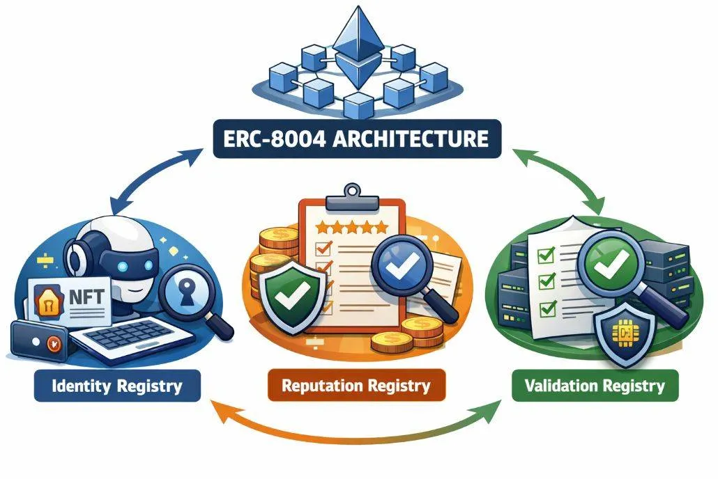 ERC-8004는 상호운용 가능한 세 가지 독립적 레지스트리를 통해 탈중앙화된 신뢰 시스템을 구축한다.