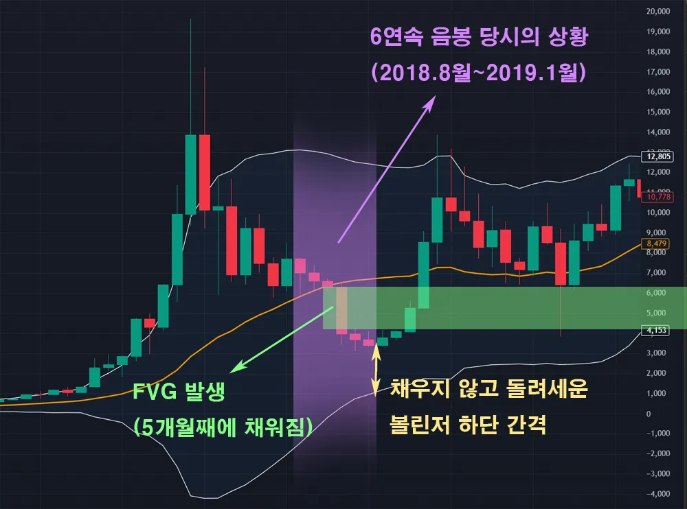 스샷 상 보라색 영역이 바로 2018년 당시 6개월 연속 당시의 차트상태 입니다. 이때와 지금의 공통점은 대략 다음과 같습니다.