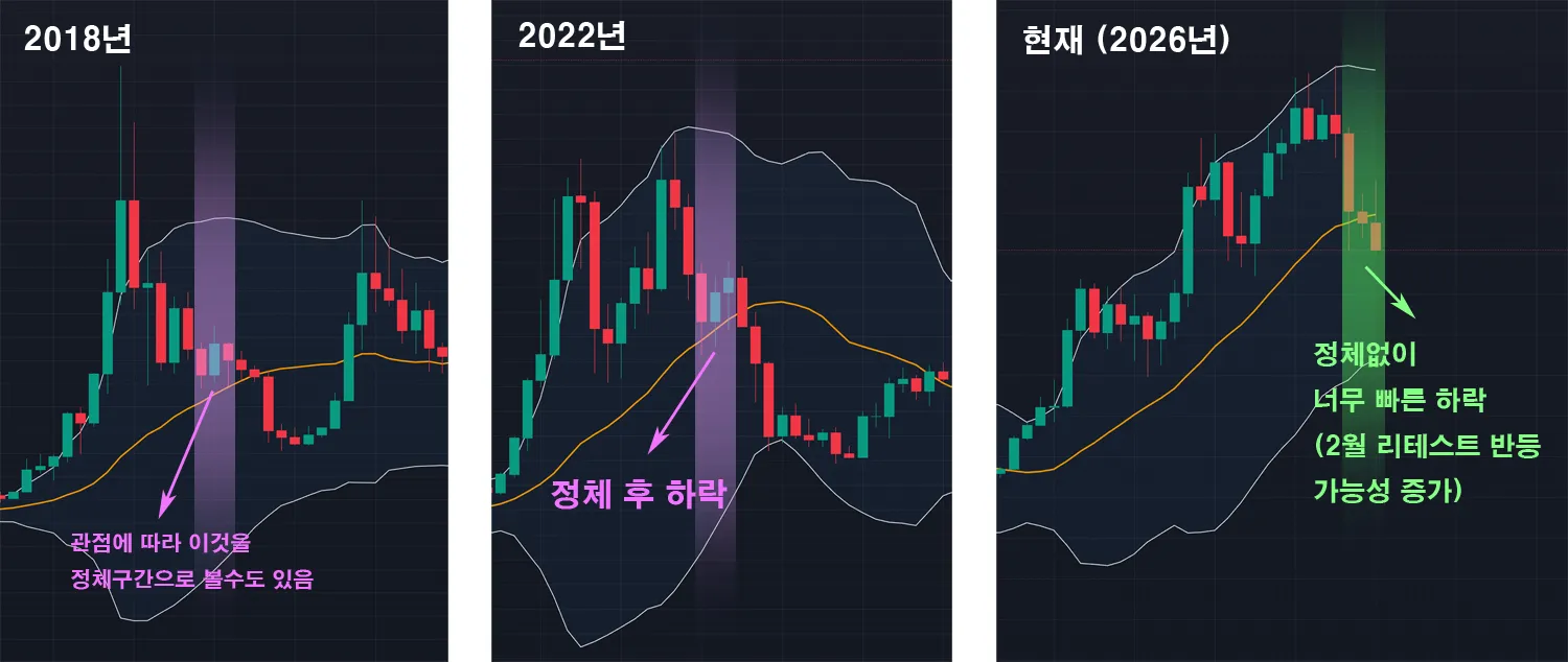 이 말은 즉, 2월 초반 (상순 경 까지) 첫 진입 방향이 상방보다는 하방을 우선 때리러 갈 수 있다는 뜻이 됩니다. 그러므로 롱을 보시는 분들은 이점에 유의하셔서 진입타이밍이 꼬이지 않도록 관리하는 것이 중요하다고 보이며, 개인적으로는 롱을 보기 보다는 잠시 매매를 쉬면서 관찰한 뒤 2월봉이 볼린저 중앙선까지 다시 붙이는 리테스트 시도를 한다면 그 구간에서 머리를 들면 숏으로 때린다는 관점으로 지켜보는게 승률이 더 높게 나올것 같다는 생각입니다.