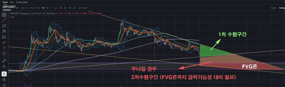 XRP의 경우 BTC보다 깔끔한 분석이 가능하도록 차트가 그려지고 있습니다. 스샷에 표시한 부분들을 보면서 다음과 같이 이해하시면 되겠습니다.