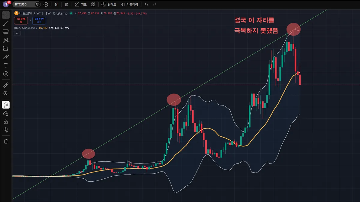 2) 상단선에서 중앙선까지 하락한 뒤 정체하는 구간 없이 다이렉트로 붕괴시킴 (=22년도 때처럼 중앙선에서 3~4개월 비비는 시도가 없었음)