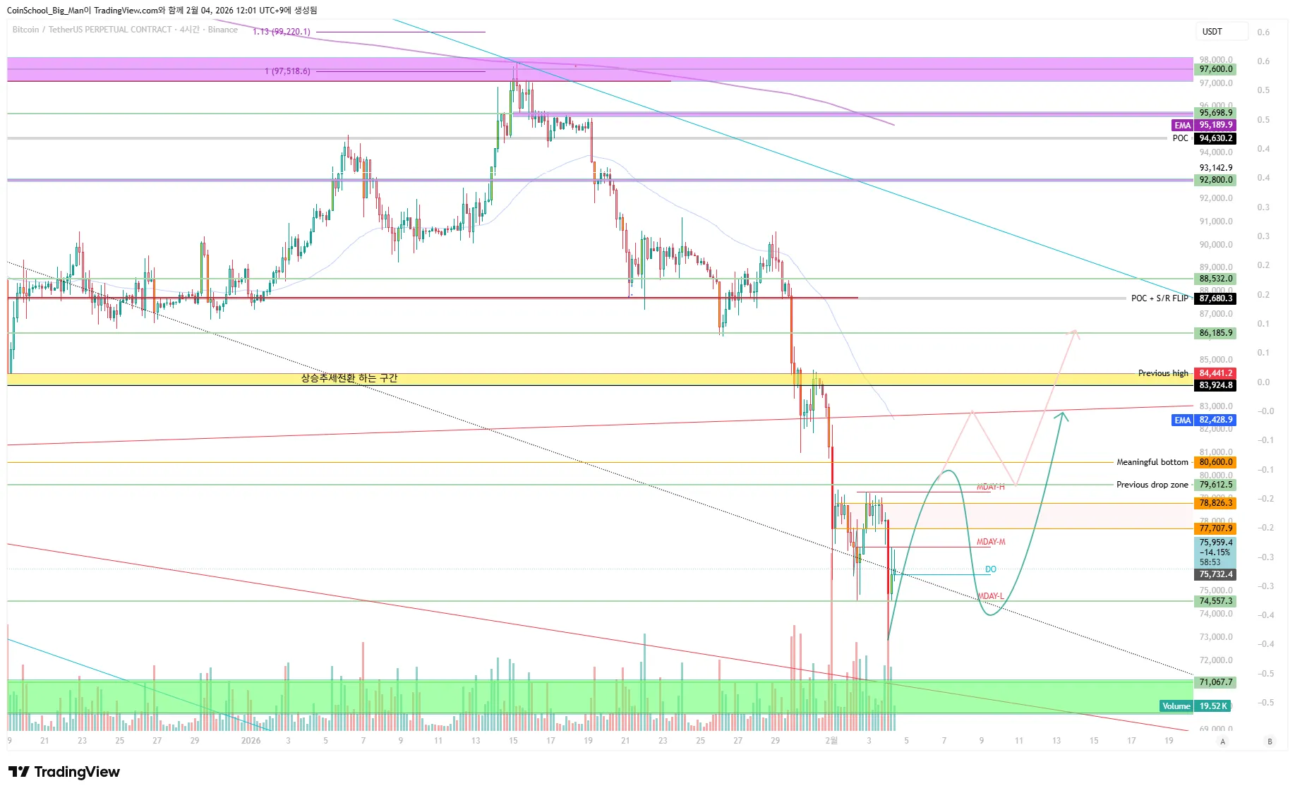 그리고 눌림이 나오더라도 76K를 지켜준다면 추가상승 81.4K 까지도 상승이 가능합니다. 또한 하락이나오더라도 74.5K를 지켜주는 흐름이 중요합니다