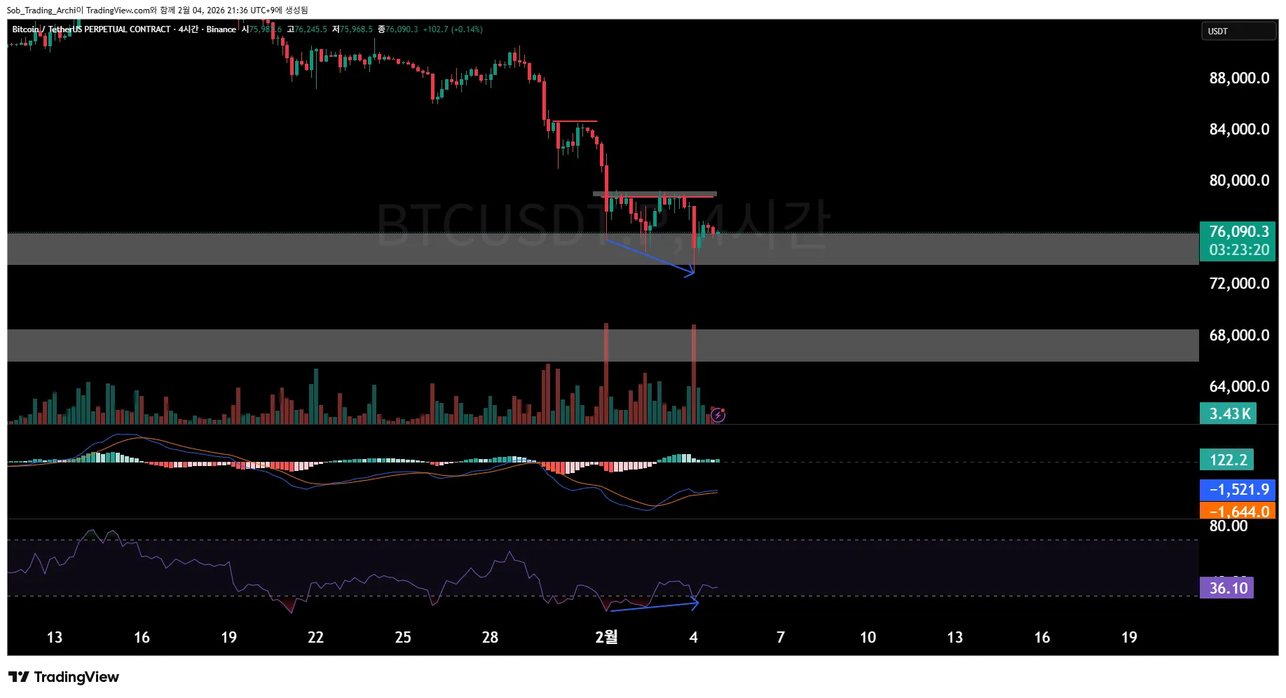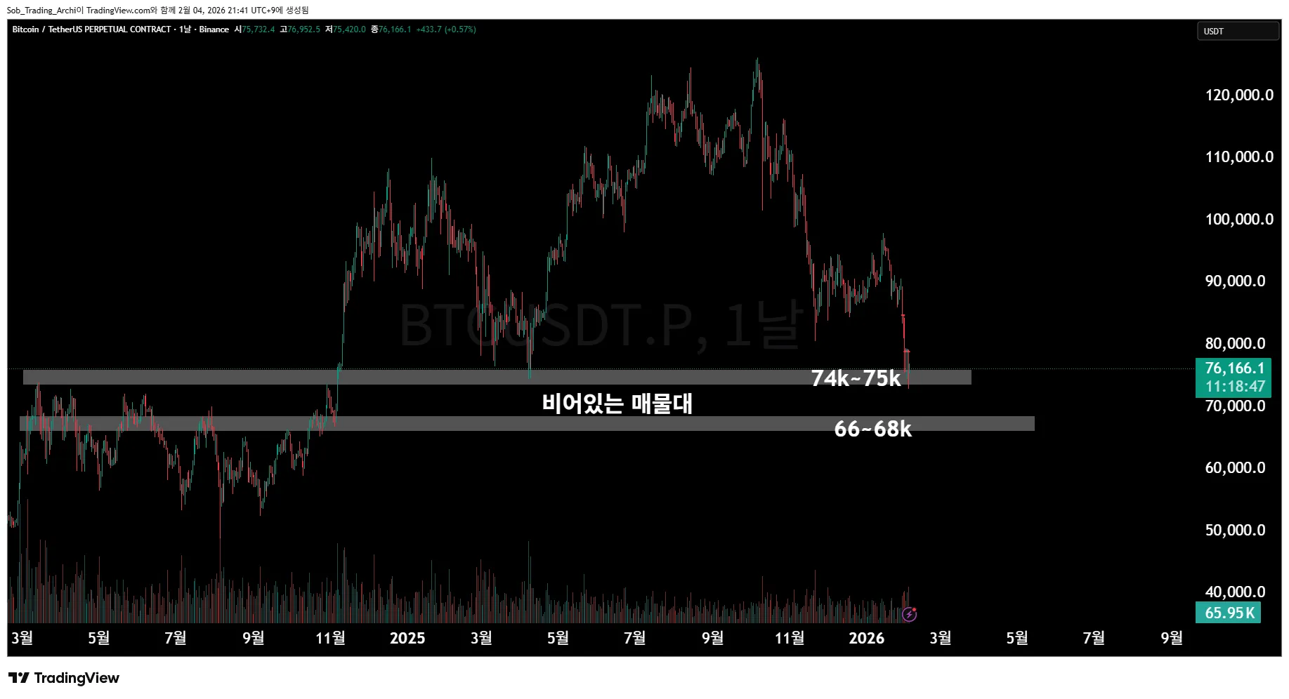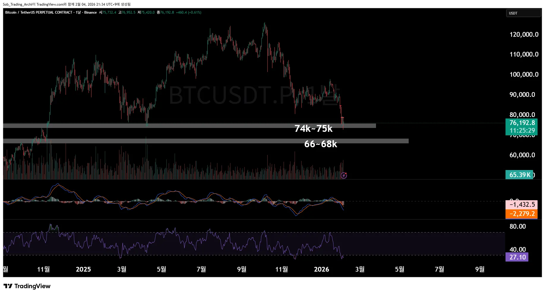 말씀드린 74~75k 지지를 받고 있는 상황에서 또 추가 하락이 나온다면
