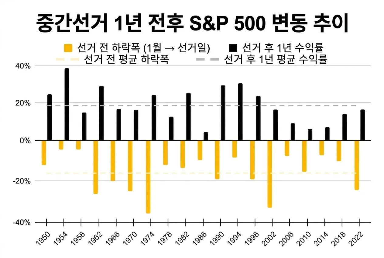 중간선거가 있는 해에는 정치적 불확실성으로 인해 S&P 500 지수가 평균적으로 최고점에서 최저점까지 약 16% 하락하는 추세를 보였으며, 이는 4년 대통령 선거 주기 중 가장 약세인 해로 나타났습니다. 지난 10번의 중간선거 중 7번은 하락폭이 10%를 넘었습니다.