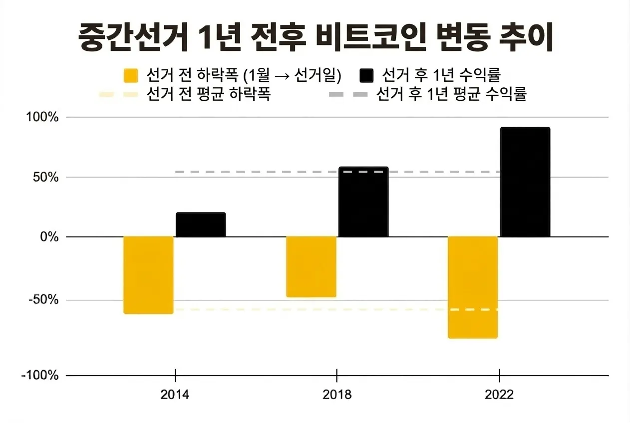 비트코인 역시 중간선거 후 3년 동안 모두 상승세를 보였으며 평균 54%의 상승률을 기록했습니다.