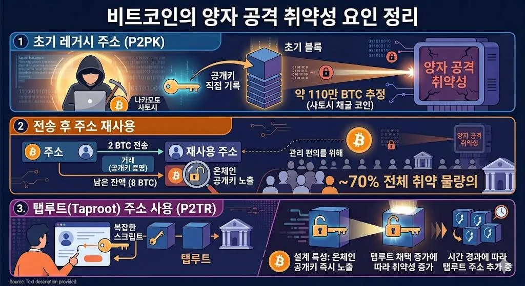 첫 번째는 초기 레거시 주소입니다. 비트코인 초기에는 기술적 편의상 공개키를 암호화하지 않고 그대로 블록체인에 기록하는 방식을 사용했는데, 이로 인해 양자 공격에 가장 취약해질 수 있다는 것입니다. 비트코인 창시자 나카모토 사토시가 채굴한 것으로 추정되는 약 110만 개의 비트코인이 여기에 해당합니다.