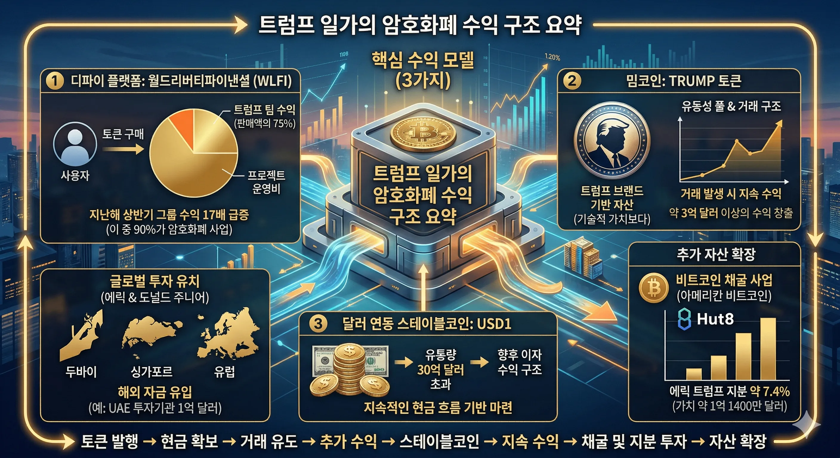 결과적으로 트럼프 일가의 암호화폐 수익 구조는 △토큰 발행 →현금 확보 △거래 유도→추가 수익 △스테이블코인→지속 수익 △채굴 및 지분 투자→자산 확장 으로 이어지는 다층적 구조를 갖추게 됐습니다.