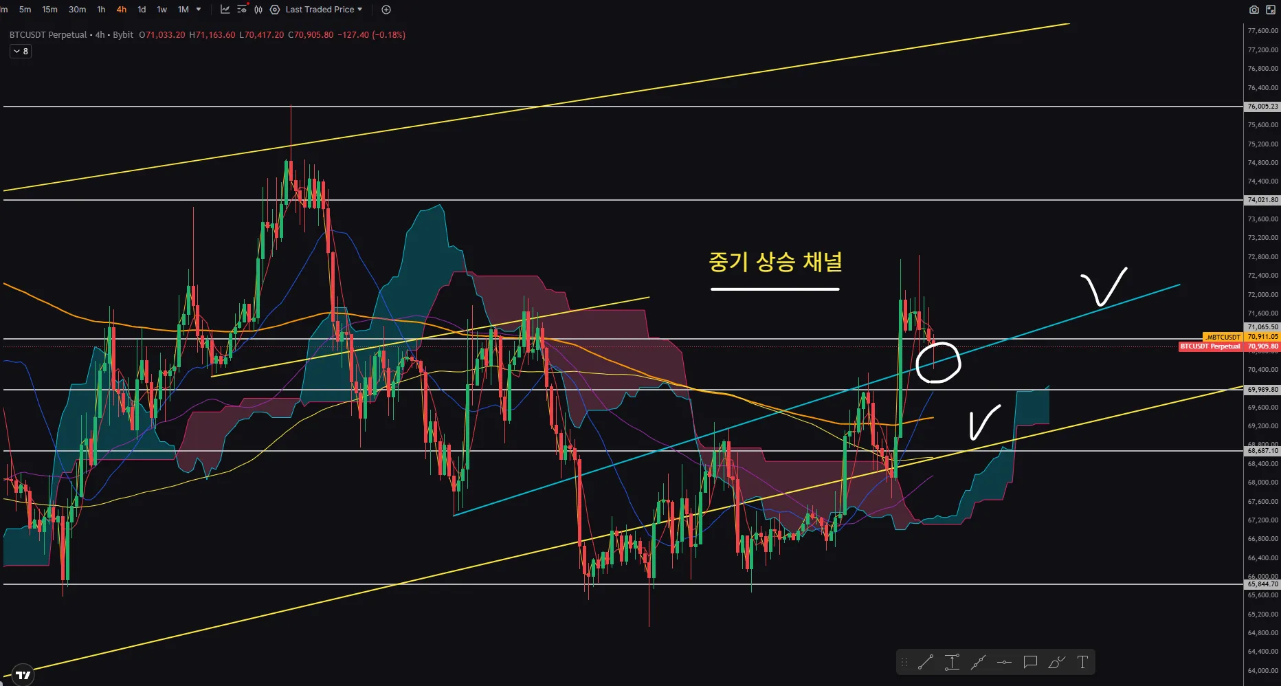 - 70.5 ~ 71K = 핵심 넥라인 (상승 유지 기준선)