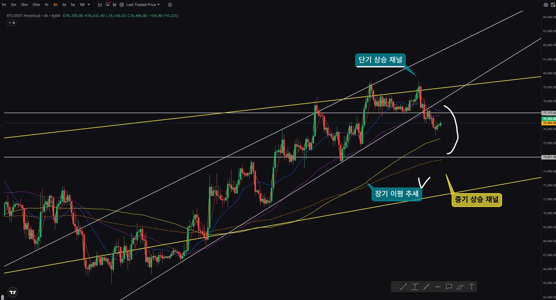 - 단기 상승 채널 이탈 이후 조정 흐름 진행 중