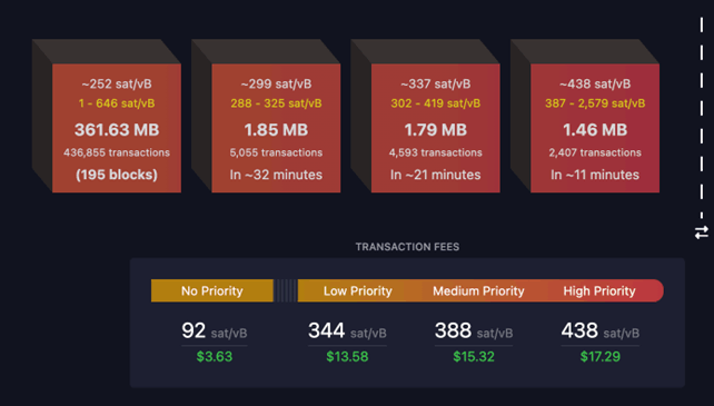 비트코인 기반 NFT라고 할 수 있는 오디널스(Ordinals Inscriptions)에 이어 비트코인 기반 알트코인 BRC-20의 흥행으로 인해, 비트코인 채굴자들의 수수료 수입은 2년 만에 최고치에 도달했으며 멤풀에서 대기 중인 트랜잭션이 43만 개를 초과하며 엄청난 수의 트랜잭션이 펜딩되는 현상이 발생했습니다.