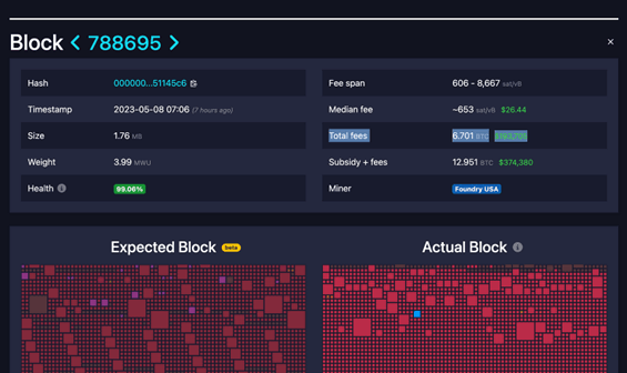 지난 5월 8일 비트코인 네트워크의 #788695, #788700, #788702 이 3개의 블록은 수수료가 블록 보상(block subsidy)을 초과하는 블록으로, 이는 사람들이 더 많은 돈을 지불하고서라도 비트코인 메인넷을 이용하고자 했던 수요가 매우 높았음을 의미합니다.