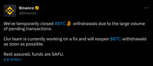 덕분에 바이낸스 거래소에서는 비트코인의 출금을 일시중지하는 사태까지 벌어지게 됩니다.