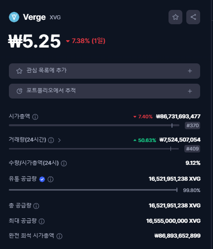 XVG 코인은 약 5.25원으로 거래가 되고 있으며,