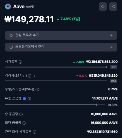 AAVE 토큰은 약 149,278만 원으로 거래가 되고 있으며,