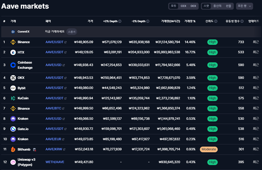 현재 AAVE 토큰이 거래가 되고 있는 거래소들 중에서
