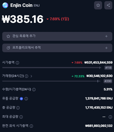ENJ 토큰은 약 385원으로 거래가 되고 있으며,