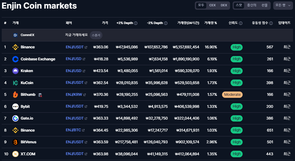 현재 ENJ 토큰이 거래가 되고 있는 거래소들 중에서
