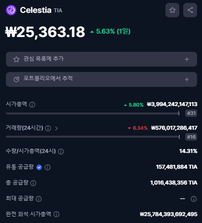 TIA 토큰은 약 25,363원으로 거래가 되고 있으며,