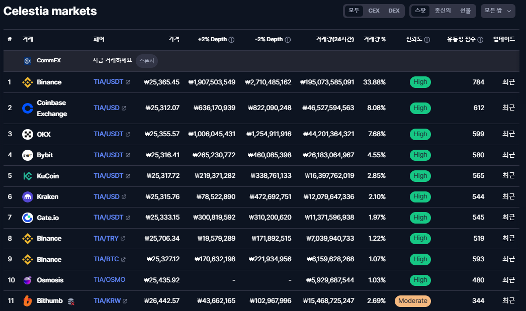 현재 TIA 토큰이 거래가 되고 있는 거래소들 중에서