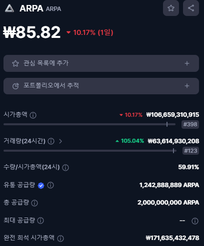 ARPA 토큰은 약 85원으로 거래가 되고 있으며,
