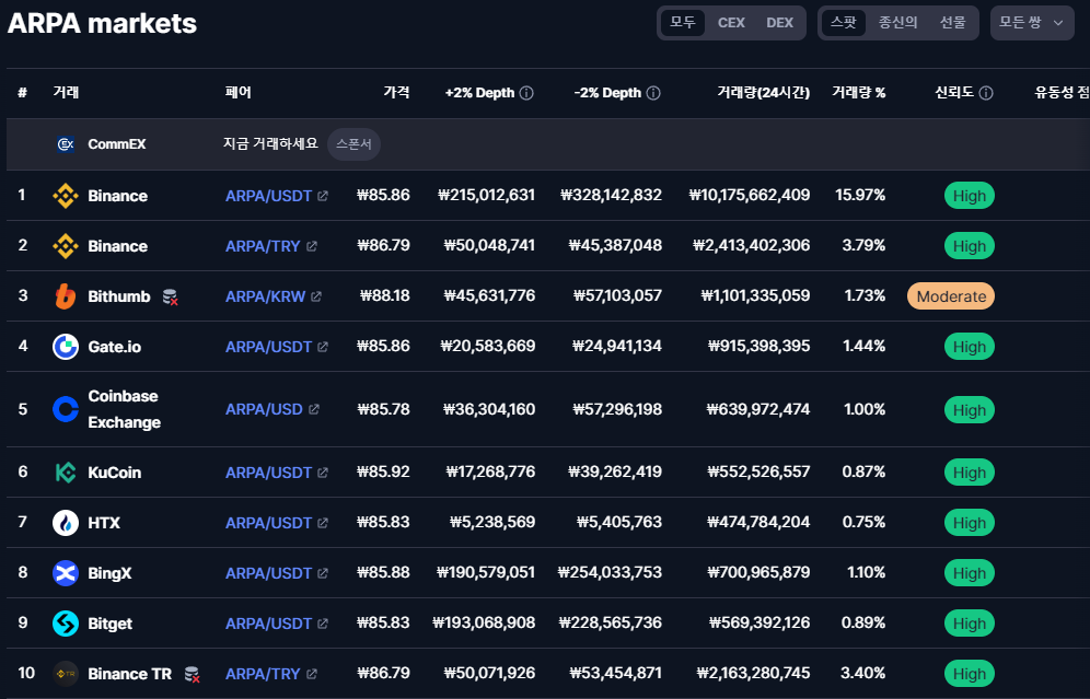 현재 ARPA 토큰이 거래가 되고 있는 거래소들 중에서
