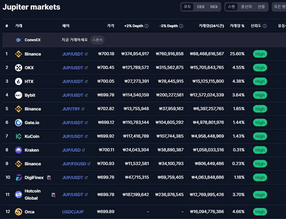 현재 JUP 토큰 거래가 되고 있는 거래소들 중에서