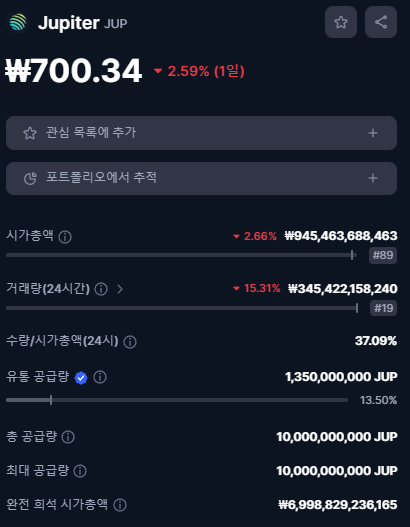 JUP 토큰은 약 700원으로 거래가 되고 있으며,