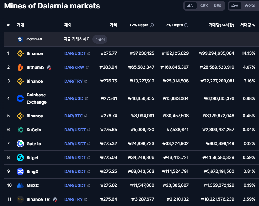 현재 DAR 토큰이 거래가 되고 있는 거래소들 중에서