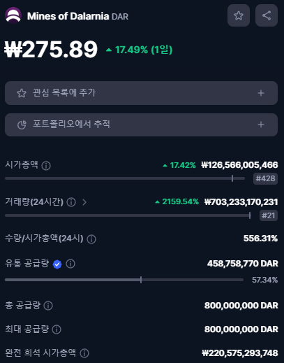 DAR 토큰은 약 275원으로 거래가 되고 있으며,