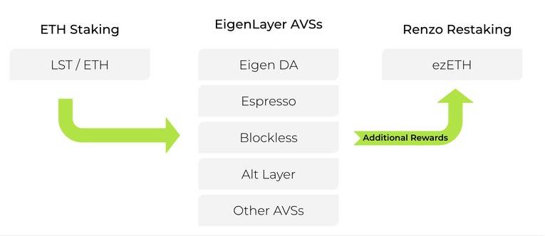 렌조에 네이티브 ETH이나 LST를 예치하게 되면 렌조는 해당 자산만큼의 ezETH를 민팅을 한다. 참고로 ezETH는 다시 출금이 되지 않기 때문에 유동성 시장에서 매도를 해야 한다. 특징 중 한 가지는 렌조를 이용할 경우에 아이겐레이어의 리스테이킹 리밋을 우회하면서도 아이겐레이어의 리스테이킹 포인트와 더불어 렌조의 포인트도 획득할 수 있다.
