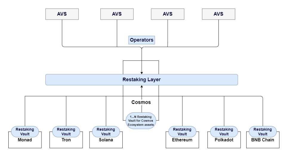 리스테이킹의 경우는 아직까지 이더리움 기반의 아이겐레이어를 통해서만 구현이 되고 있으나 피카소는 리스테이킹을 솔라나 기반에서 구현 뿐만 아니라 코스모스 생태계의 리스테이킹 레이어까지 준비를 하고 있다. 피카소는 이를 Generalized Restaking이라고 부르며 이더리움에만 국한되지 않고 솔라나, 코스모스, 폴카닷 등 여러 PoS 네트워크에서 자산을 리스테이킹할 수 있도록 확장하여 크로스 생태계 보안을 제공한다.이는 피카소가 코스모스SDK를 기반으로 여러 생태계 간의 IBC(Inter-Blockchain Communication) 허브 역할을 함으로써 가능해지는 설계이다.