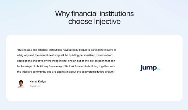 인젝티브의 주요 투자자이자 생태계 구축자인 Jump Crypto는 전통 금융에서 높은 거래량을 기록하고 있는 Jump Trading Group의 사업부이다. Jump Crypto는 인젝티브의 온체인 오더북과 통합되어 인젝티브 생태계 dApp에 유동성을 제공하는 최초의 기관 채택자 중 하나이다. Jump Crypto의 유동성 지원은 인젝티브가 글로벌 기관의 채택을 받는데, 큰 역할을 했다.