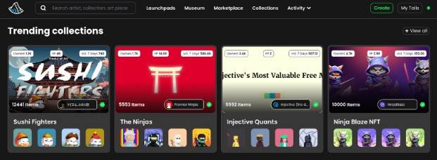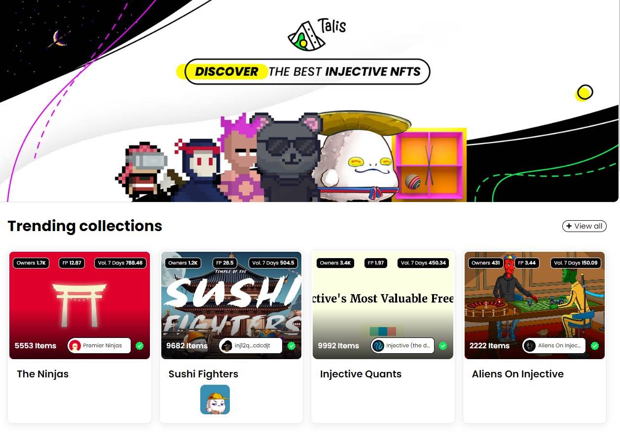 대부분의 레이어 1 블록체인은 NFT 마켓플레이스를 제공하고 있다. 탈리스는 인젝티브 기반의 NFT 마켓플레이스로 인젝티브 커뮤니티 안팎에서 수많은 NFT 제작자와 거래자를 유치하여 자신만의 방식으로 커뮤니티 문화에 기여함으로써 성장했다. 또한 인젝티브의 NFT 컬렉션은 단순한 커뮤니티 기반의 PFP를 넘어선다. 대표적인 예시로 인젝티브 퀀트(Injective Quants)는 INJ 토큰 소각에 기여하는 최초의 NFT 컬렉션이다. 인젝티브 퀀트 NFT 거래량의 5%는 소각된다. 이에 NFT가 더 많이 거래될 수록 더 많은 INJ가 소각되어 INJ 공급이 감소하게 된다. 단순한 PFP 역할을 넘어서 생태계에 기여하는 것이다.