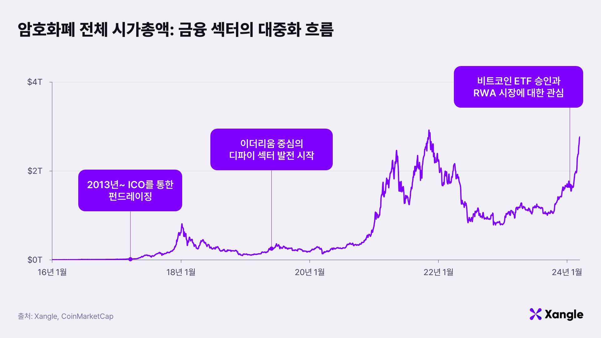 이전의 크립토 시장은 디파이, NFT, 메타버스 등의 섹터를 중심으로 성장을 해왔다면, 미국에서 비트코인의 현물 ETF 승인은 비트코인과 같은 암호화폐에 대한 기업과 기관의 접근성을 극적으로 향상한 부분에서 의미가 크다. 그동안 암호화폐 시장에 접근하기 위해서는 중앙화 거래소를 이용하거나, 직접 메타마스크나 팬텀과 같은 지갑 애플리케이션을 사용하거나, 우회적으로 마이크로 스트레티지나 코인베이스의 주식을 매수하는 등의 방법을 통해 참여 해야 했다. 그러나 비트코인 현물 ETF 승인 이후 기관과 기업은 규제하에 있는 ETF를 포트폴리오에 추가하는 것으로 간편한게 암호화폐 시장에 참여가 가능해졌다.