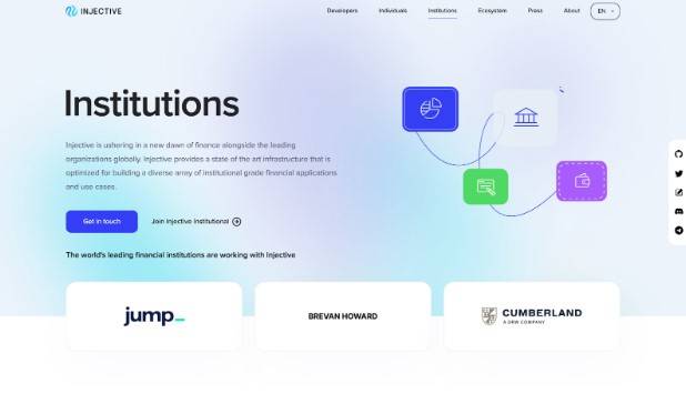 인젝티브는 금융 친화적인 인프라를 활용하여 주요 기관이 Web3 금융으로 원활하게 전환할 수 있도록 노력하고 있다. 특히 인젝티브는 Jump Crypto, Coinbase Institutional, Binance Custody 및 BitGo와 같은 주요 기관과의 협력을 적극적으로 추진하여 기관 투자자의 접근을 여러 분야에 걸쳐 확대했다.