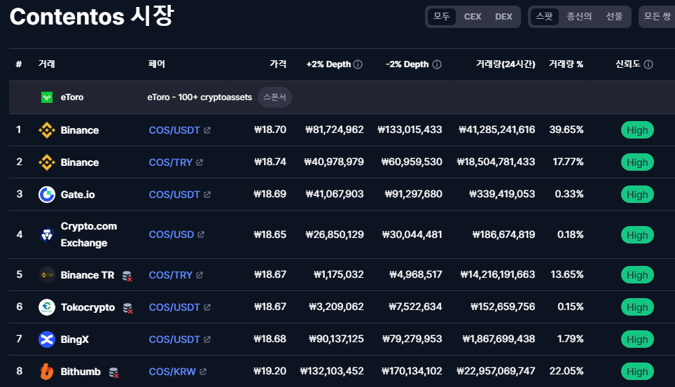 현재 COS 토큰이 거래가 되고 있는 거래소는