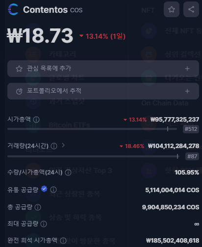 COS 토큰은 약 18.73원으로 거래가 되고 있으며,