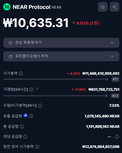 NEAR 토큰은 약 10,635원으로 거래가 되고 있으며,