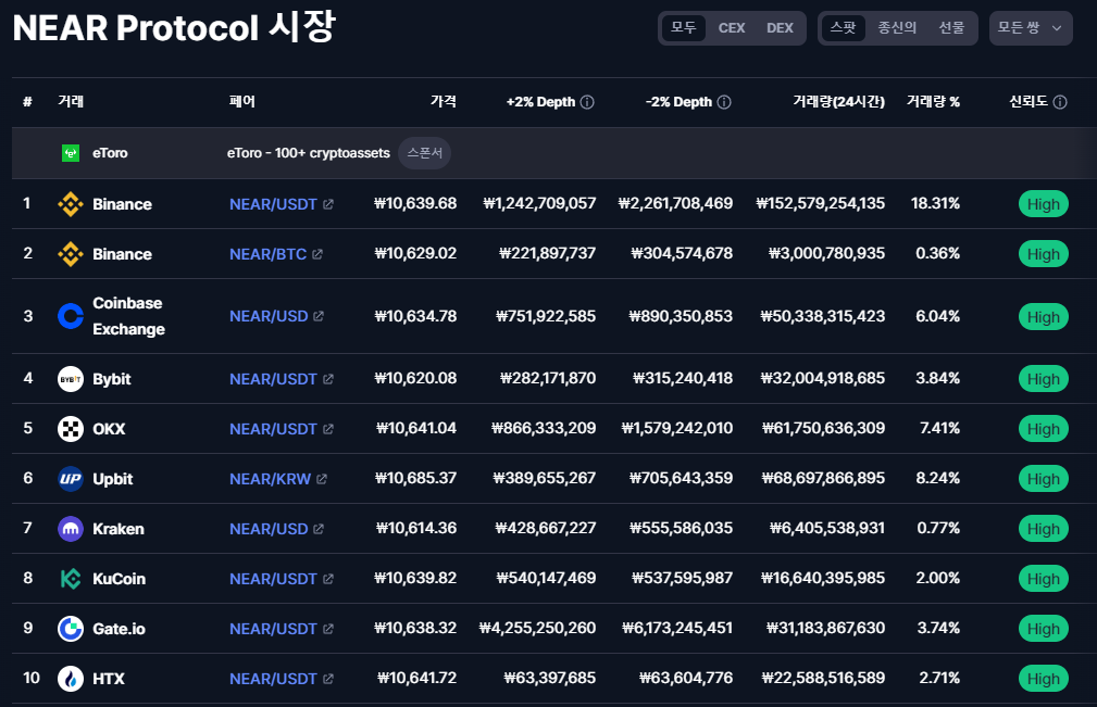 현재 NEAR 토큰이 거래가 되고 있는 거래소들 중에서