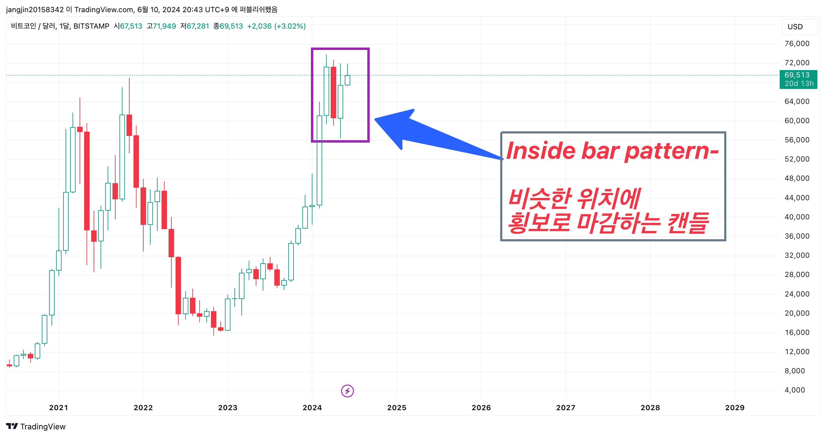 이번 달 월봉 마감 71k 위로 못 하면 조정 장세 올 수 있습니다. - 코인니스