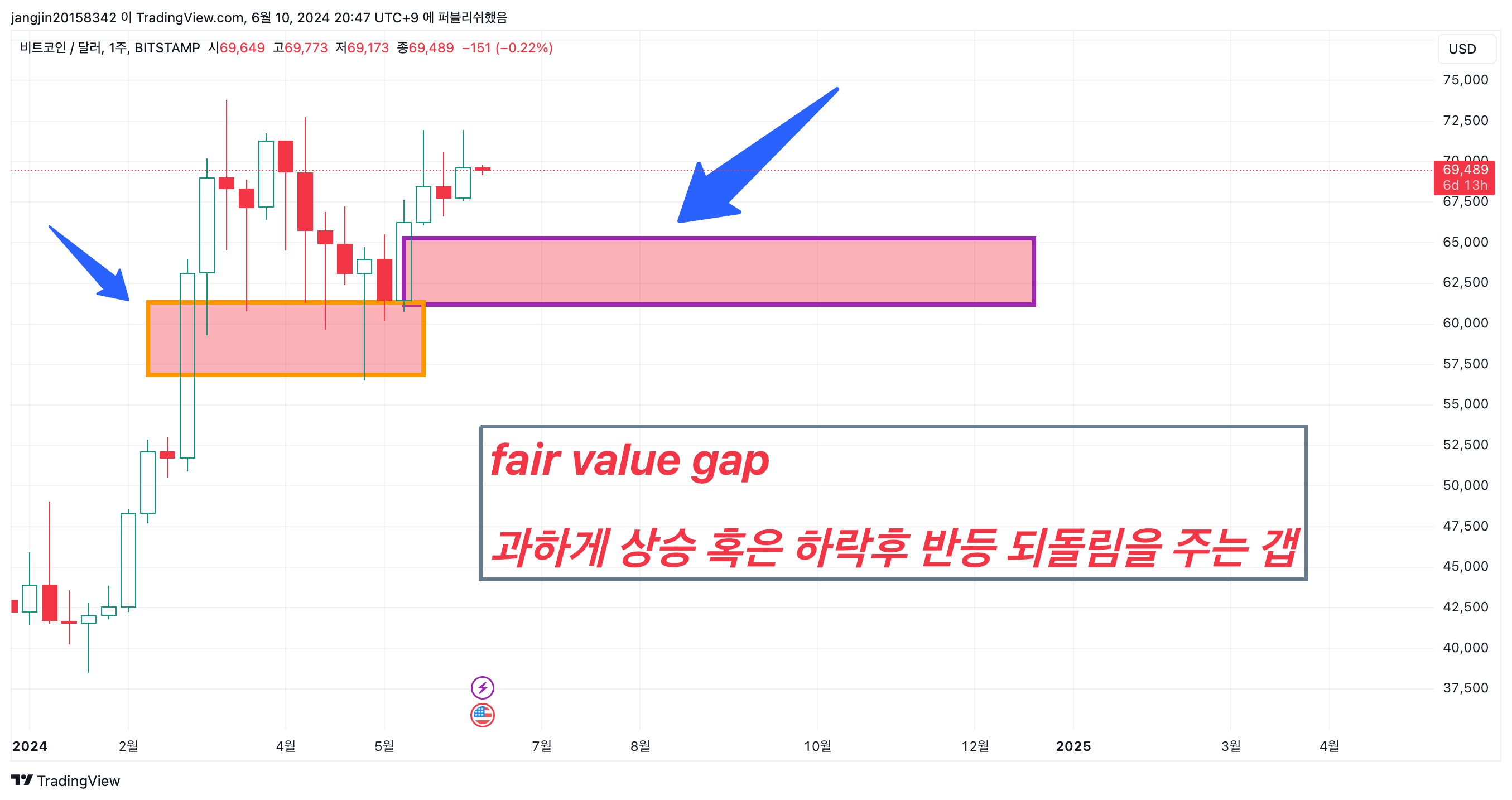 주봉 차트입니다. 오늘 제목에서 나온 대로 FVG (Fair value gap)이 아직 남아있는 상황입니다. FVG란 SMC( 똑똑한 투자자들의 컨셉) 중 하나의 용어이며, 과하게 주가가 상승 혹은 하락을 하면 상승 혹은 하락한 추세 중간 쯤 되돌림을 주는 현상이라고 이해하시면 됩니다.