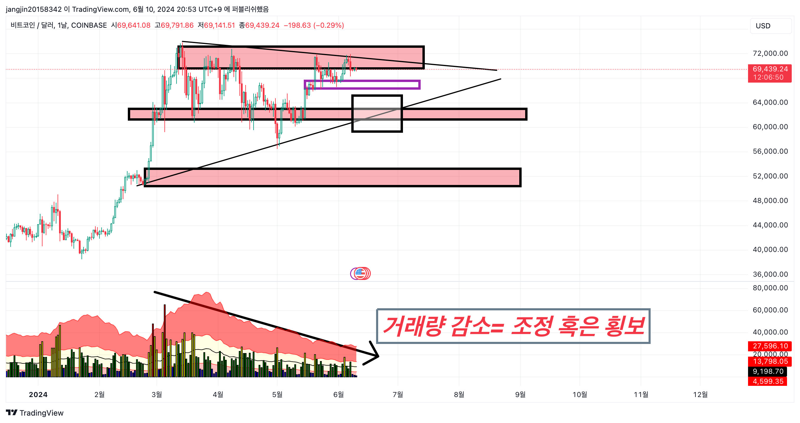 비트코인이 약 90일간 횡보를 하면서 박스권을 그려주고 있는 듯 한 모습입니다. 오늘은 fair value gap이라는 것과 매물대 그리고 기술적 분석을 통해 제가 생각하는 시나리오를 알려 드리 도록 하겠습니다.