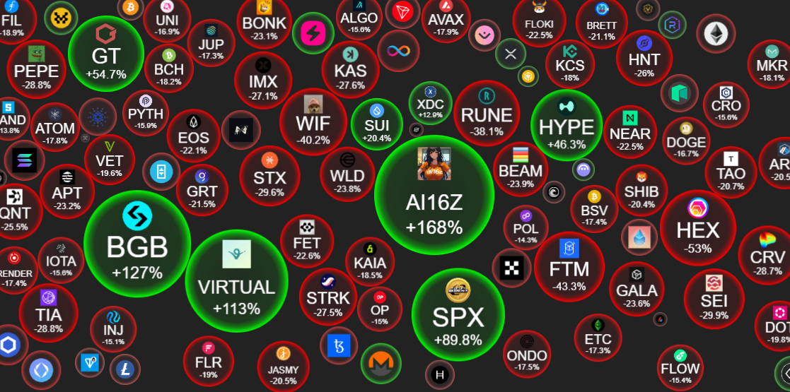 에비토는 최근 한 달 시가총액 100위 코인 상승률 1위(AI16Z +168%), 3위(VIRTUAL+113%)
