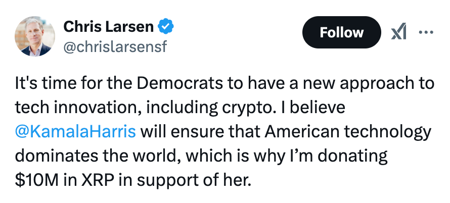 리플은 자신들에게 유리한 규제 환경을 만들기 위해 적극적으로 정치권에 로비해 왔습니다. 51억 9000만 개의 XRP와 회사 지분 17%를 보유해 한때 미국 5위 부자에 올랐던 공동창업자 크리스 라슨은 지난 대선에서 카멀라 해리스 지원을 위해 1,000만 달러 상당의 XRP를 기부했습니다.